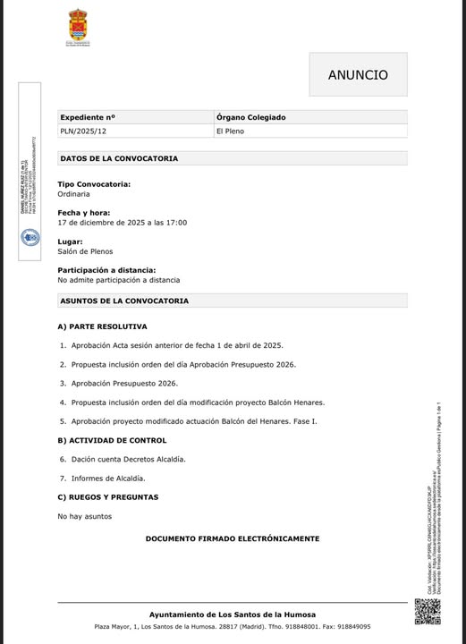 Convocatoria de Pleno Ordinario. View Larger Image Ayto Los Santos2025-12-15T11:31:25+00:00 Share This Event! FacebookTwitterLinkedInWhatsAppPinterestEmail Publicaciones recientes Navidad en la Plaza Mayor de los Santos de la Humosa Gallery Navidad en la Plaza Mayor de los Santos de la Humosa diciembre 13th, 2025 | 0 Comments TALLER DE NAVIDAD Gallery TALLER DE NAVIDAD diciembre 9th, 2025 | 0 Comments Día de la Constitución Gallery Día de la Constitución diciembre 6th, 2025 | 0 Comments Dejar un comentario Cancelar la respuestaComentario Save my name, email, and website in this browser for the next time I comment.