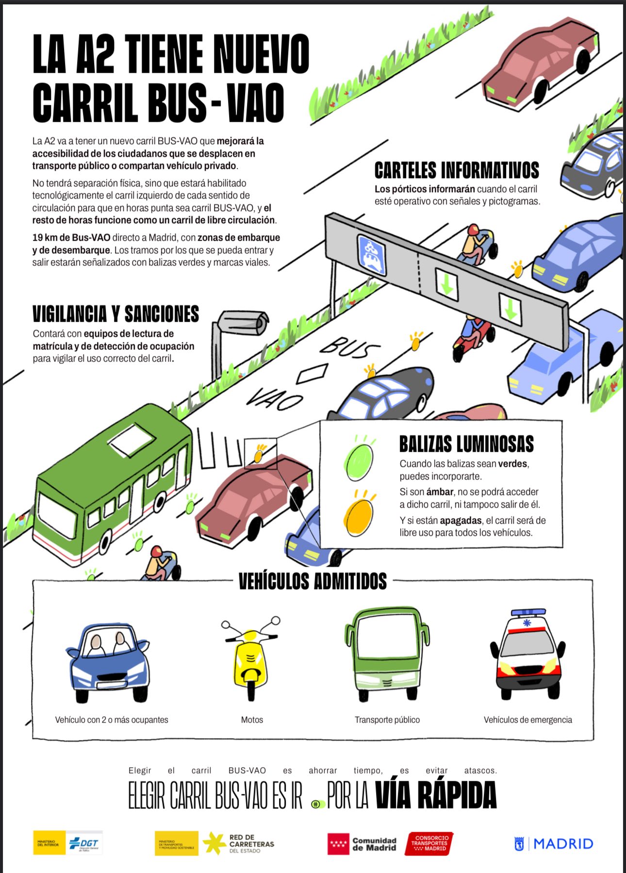 Os dejamos información de interés general, para dar a conocer el funcionamiento del nuevo carril Bus-VAO de la A-2 que comenzará a prestar servicio en el primer trimestre de 2026.