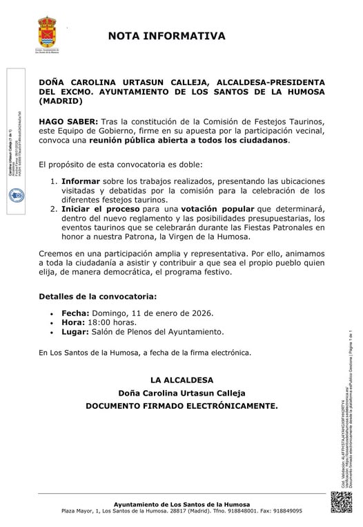 Reunión pública abierta a todos los ciudadanos View Larger Image Ayto Los Santos2026-01-11T11:37:40+00:00 Share This Event! FacebookTwitterLinkedInWhatsAppPinterestEmail Publicaciones recientes Afección al tráfico C/ Fuente del lobo con vuelta a M226 Gallery Afección al tráfico C/ Fuente del lobo con vuelta a M226 enero 9th, 2026 | 0 Comments Gran Cabalgata 2026 Los Santos de la Humosa Gallery Gran Cabalgata 2026 Los Santos de la Humosa enero 9th, 2026 | 0 Comments Concurso de fachadas navideñas 2025 Gallery Concurso de fachadas navideñas 2025 enero 9th, 2026 | 0 Comments Dejar un comentario Cancelar la respuestaComentario Save my name, email, and website in this browser for the next time I comment.